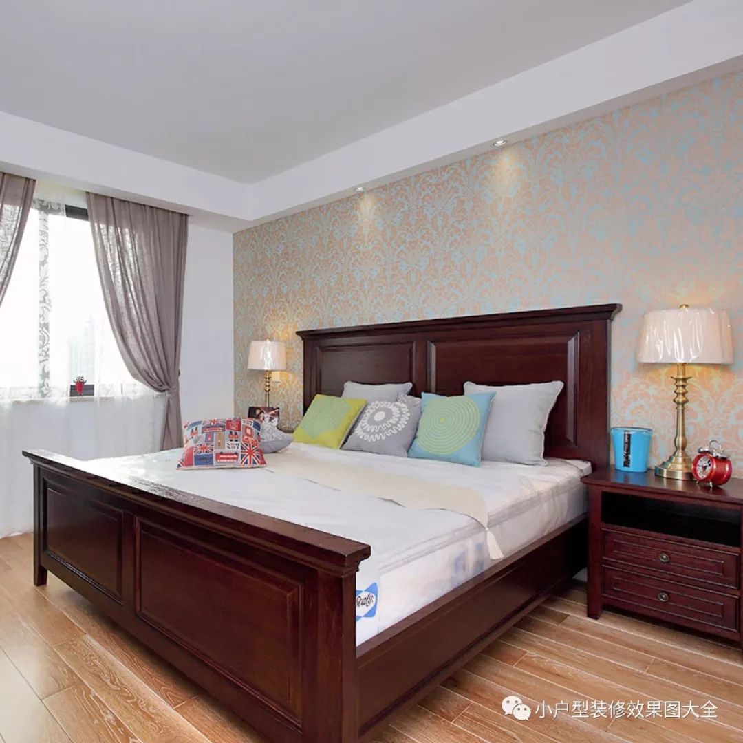 暗橙色花纹的床头壁纸,暗棕色的实木美式的床,地上的仿木地板,简单温馨。