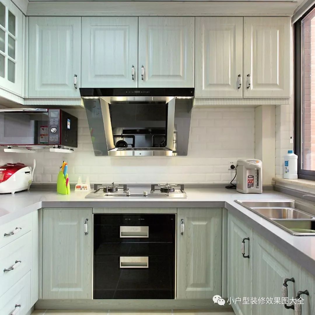 厨房里用米色的地板搭配浅豆沙绿的橱柜,颜色的搭配很是清新,整个厨房里功能区设计也是很分明的,格局上也是很实用的。