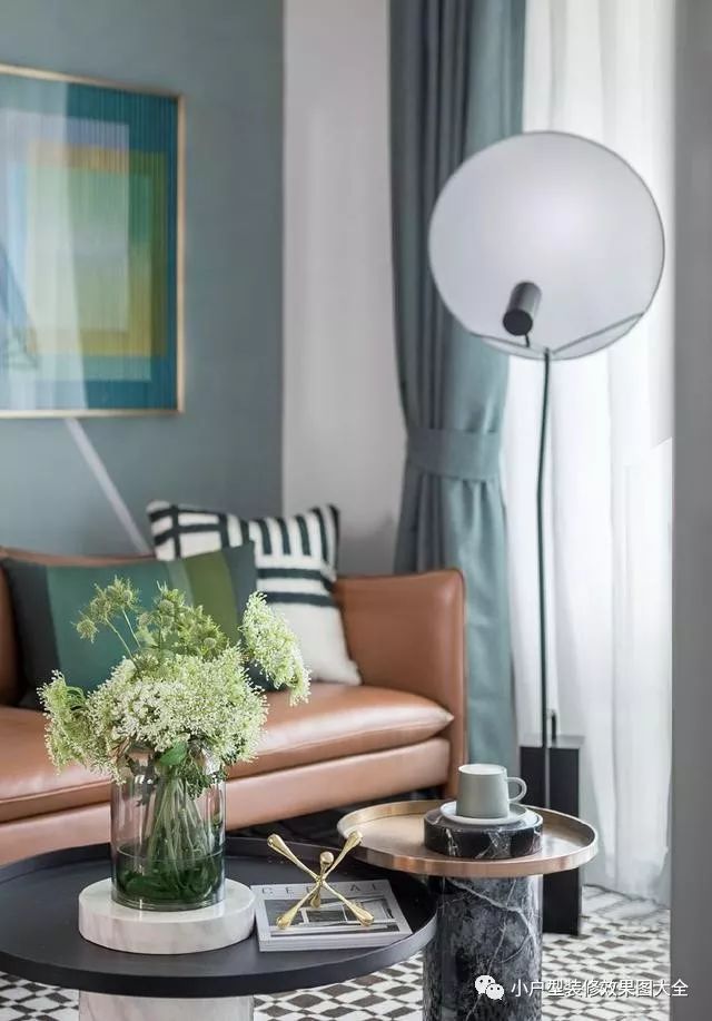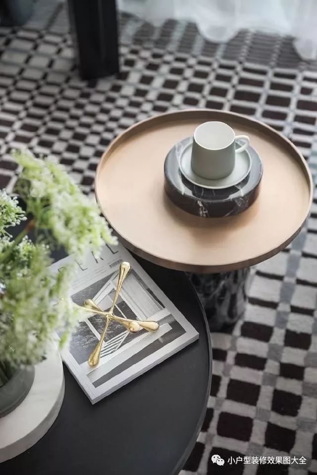 沙发前摆放的两个小茶几,上边装饰的细节也是很精致时尚的。