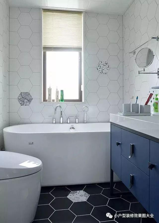 黑白色花砖拼就的浴池装饰,黑色的百叶窗和白色的墙壁,暖暖的灯光映衬着整个卫生间的氛围,虽然小但是确实很小巧精致。