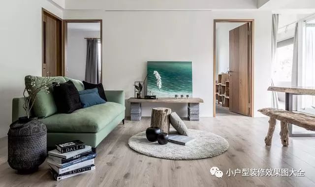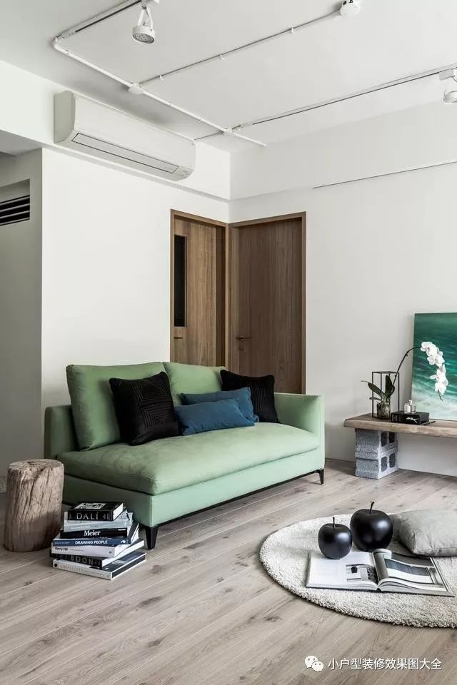 纯洁简约的白色,天然感十足的绿色,几个深色的抱枕搭配,原木的地板带着木材天然的纹理,还有客厅里各种小家居都是不加修饰的原始造型,更添放松感。