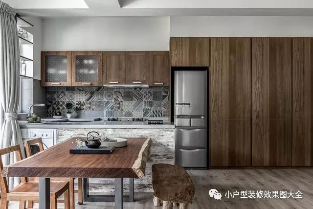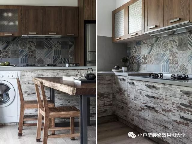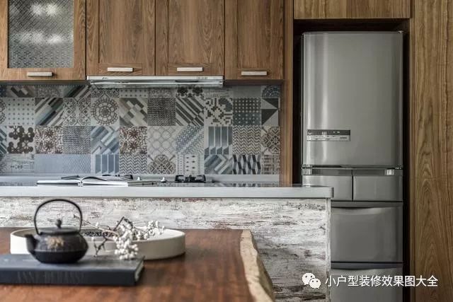 厨房设计在了落地窗前,仿灰木纹里的橱柜图案,大理石材质的流离台面,花砖的灶台背景墙,开放式设计的厨房更彰显了整个空间的开阔明朗。内嵌式的家用电器也是很大程度上节省了空间。