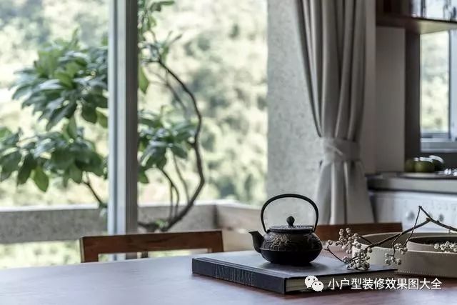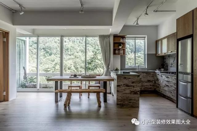 大大的落地窗前,造型粗犷的原木材质餐桌椅,带着它自己独有的纹理,简易的样式搭配上外边天然的美景,吃饭的同时都能感觉到心情的舒爽。