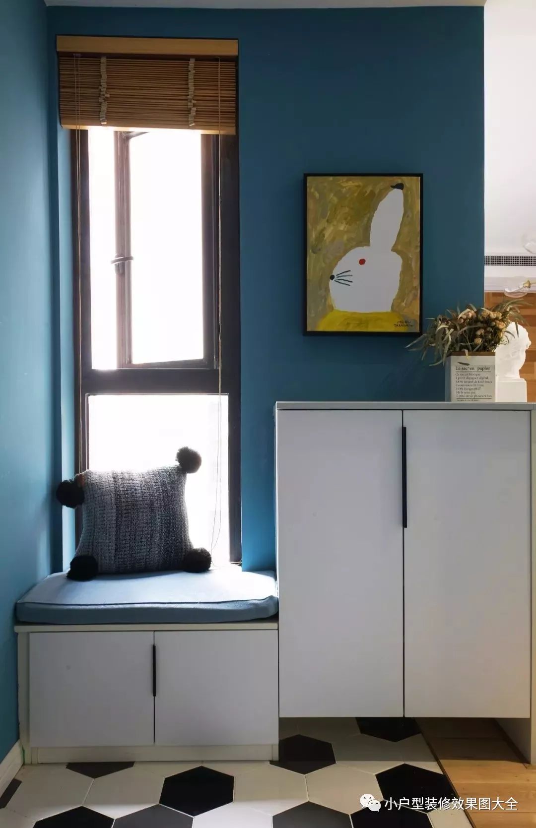 蓝色的墙壁,一扇小小的长湖,搭配着竹制的卷帘窗帘,下边一个小飘窗的坐凳,同时还是收纳柜,黑白灰三色的六边形地板,整个玄关的设计进很是实用精致。