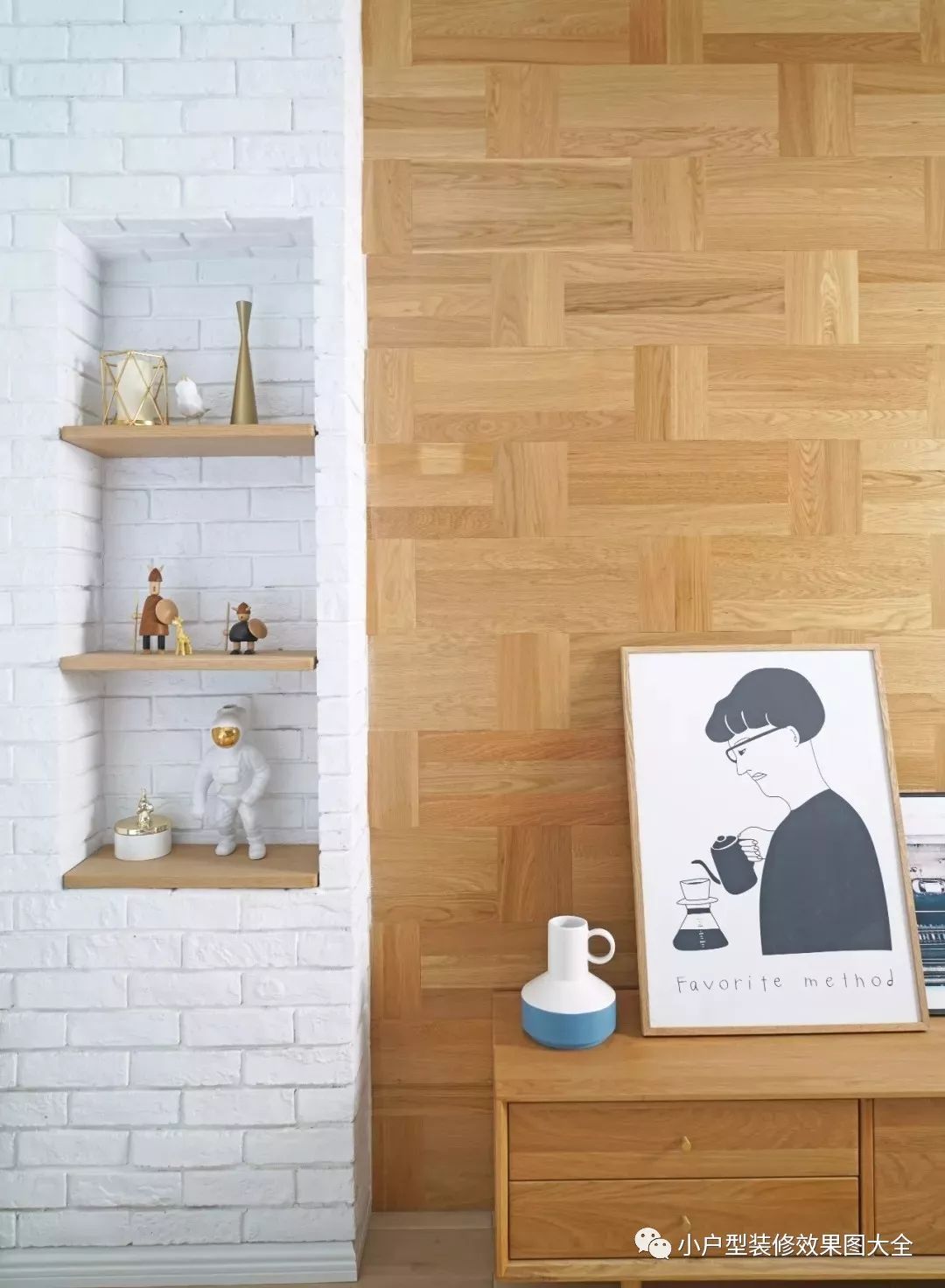 仿木质的背景墙,上边摆放着些艺术画作,旁边的白色墙砖的墙上中间内扣出来的一个小格子,摆放着些小艺术品。