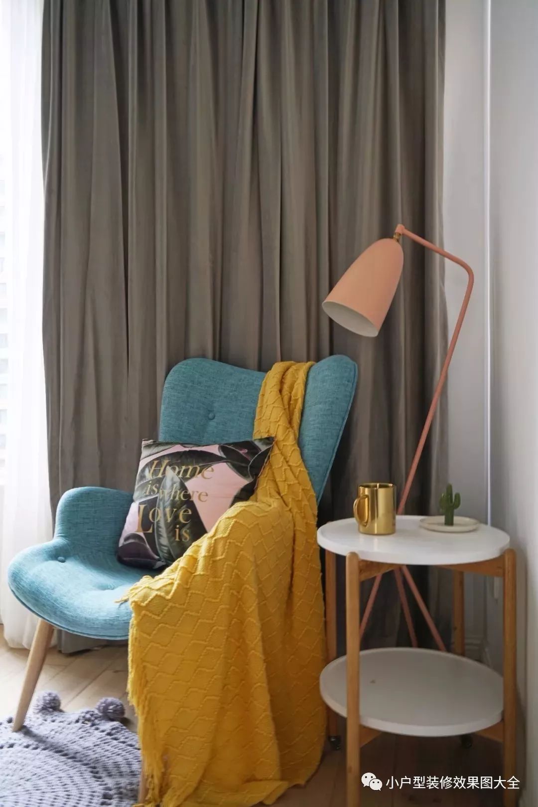 窗边还放置了一张蓝色的沙发躺椅,搭配着一个粉色的简易落地灯,是不是很可爱?