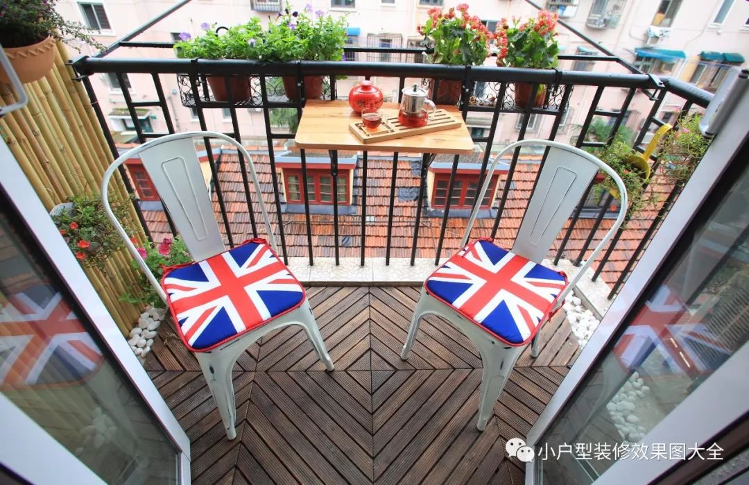 小阳台上用了刷黑漆的金属围栏,墙上挂着小绿植,放上两把座椅,围栏上挂着一个小木桌,一个简易的阳台休闲室就这么诞生了。