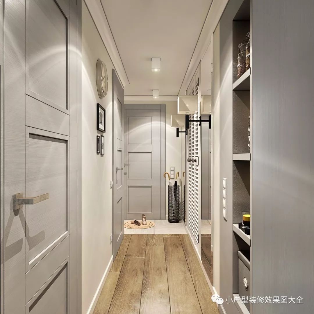 和其他的小户型不同,这个一居室小户型在设计的时候很注重各个功能区的分工。玄关是一个比较狭长的过道,米色的墙壁搭配银色的房间门,墙上的各种灯光装饰,营造了一种超强的时尚质感。