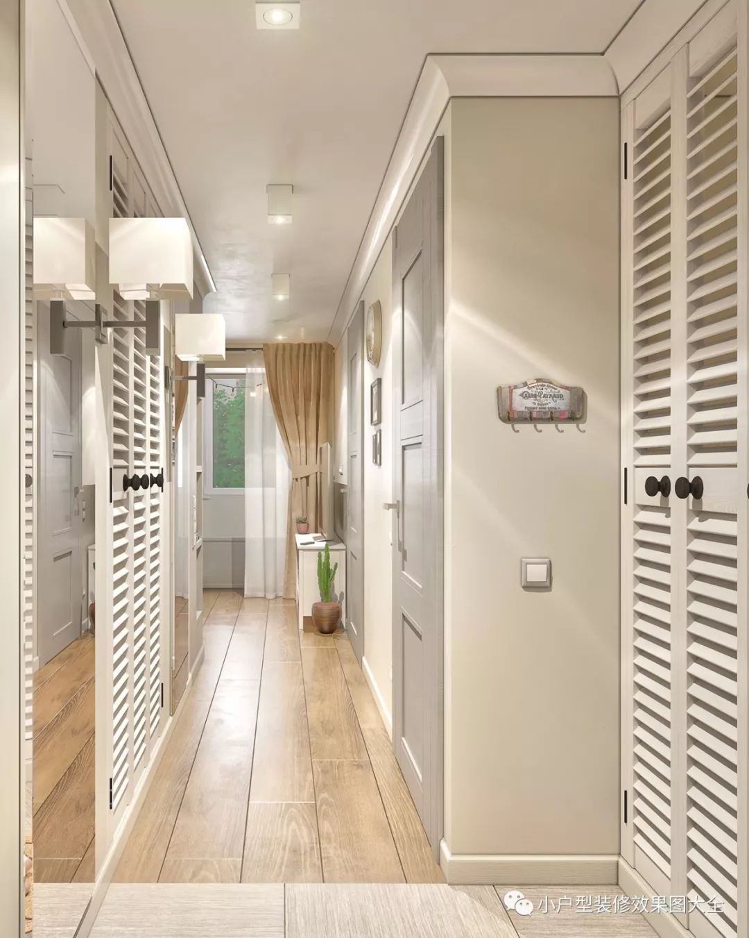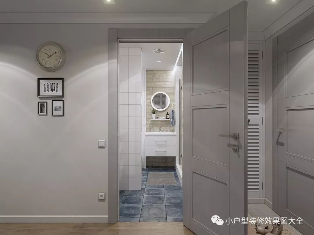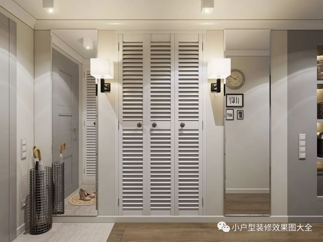 进门的对方用的是米白色的瓷砖地板,这样的材质比较容易打理,玄关的左边是百叶窗似的双开门到顶衣柜,旁边一面全身镜和雨伞收纳篮,墙上两盏壁灯给人一种温暖的感觉。