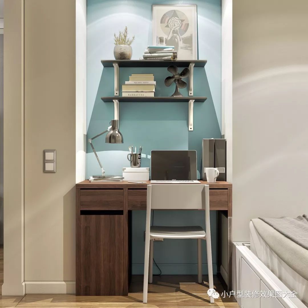 进门的右边是拉帘的衣柜,左边是书桌,蓝色的背景墙,还能让人在工作学习的时候感到放松。