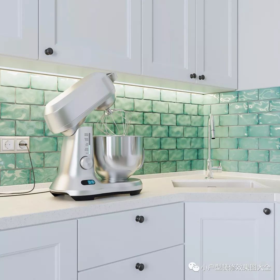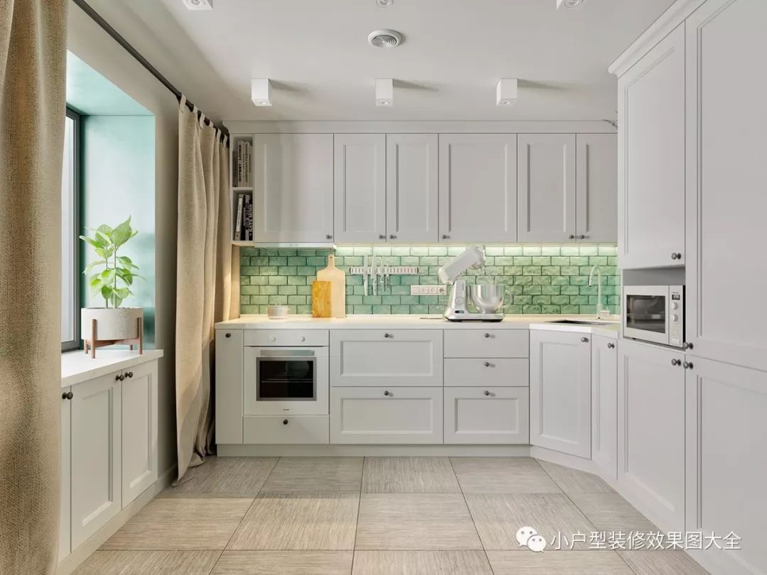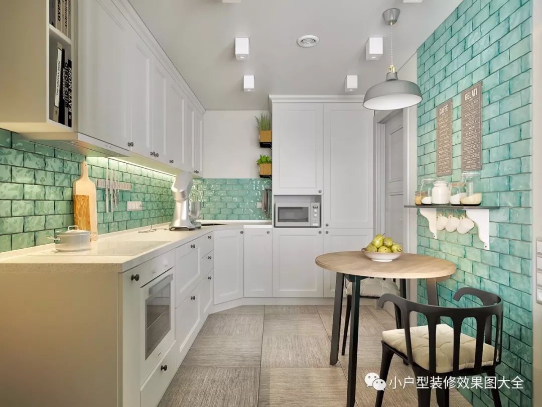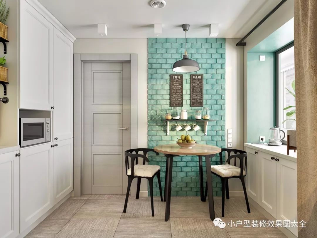 餐厅和厨房也是在一起的,白色的厨房家具,搭配蓝绿色的瓷砖,就像在厨房里设计了水墙一样的效果,这种镜面的瓷砖,美观还比较容易清理。厨房墙边摆放一张小圆桌,就是简易的餐厅了。