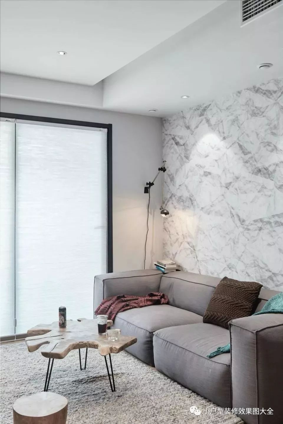 小型的灰色布艺沙发,大理石纹理的背景墙,下方搭配的是一张针织的地毯,上方一张木材质的造型自然茶几,很有一种自然的感觉。