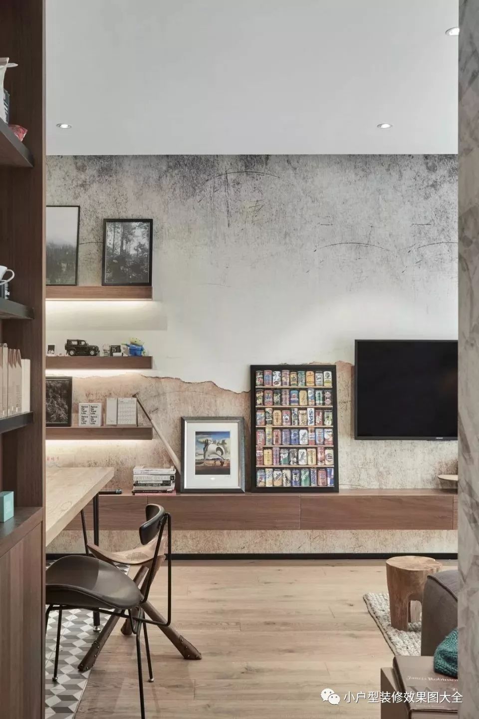 电视背景墙也是一副精致的画作,就像是一副超大的山水画,悬空的展示台正好就是电视柜,上边摆放一些小装饰品,背景墙上还有一些小展示柜,搭配隐形的灯带,上边摆放些画和艺术品,很有一种文艺范儿的复古感。