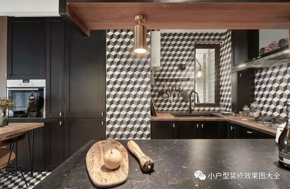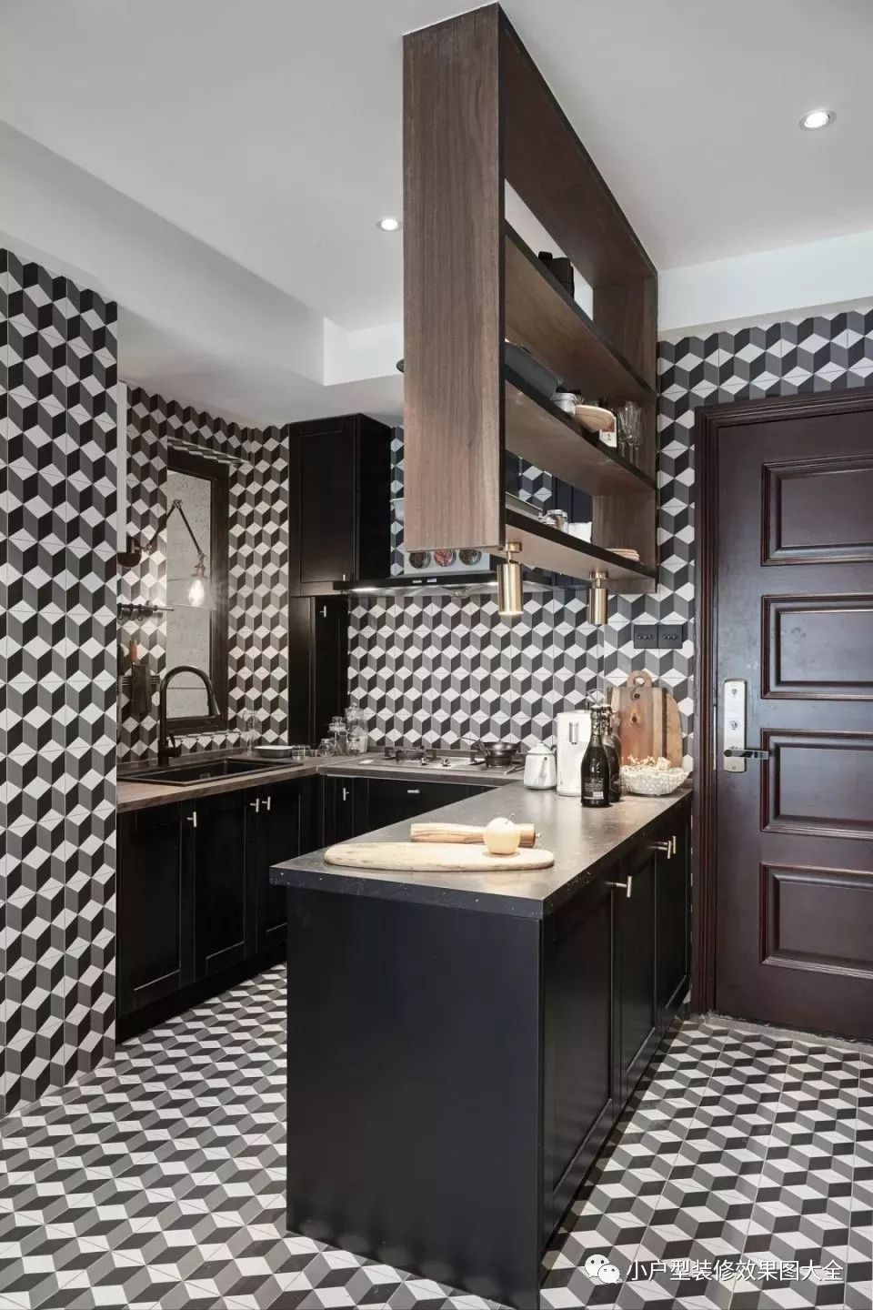 U型的厨房格局,格子的地板和墙壁让整个厨房带有很强烈的立体感。