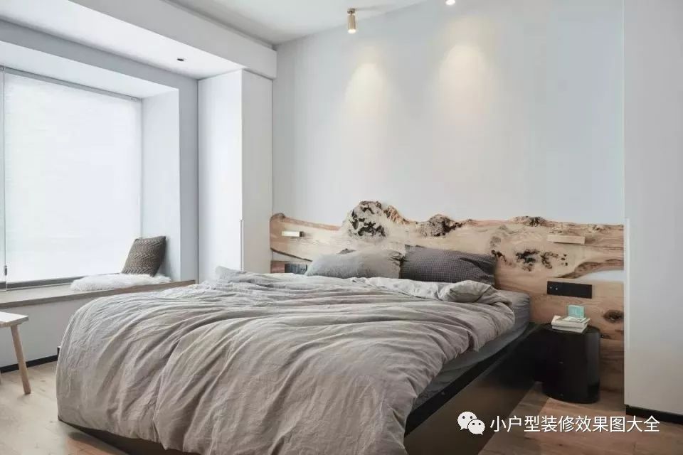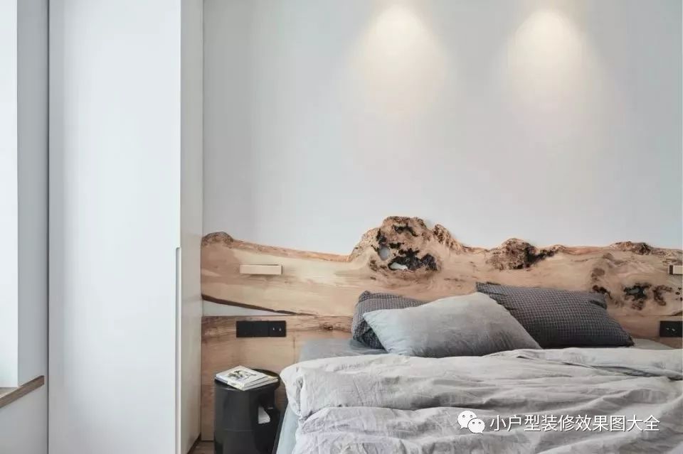 造型自然个性的床头背景墙和墙壁装饰,在这个白色的卧室里,就是很好的天然的装饰品,更带有一种自然感。