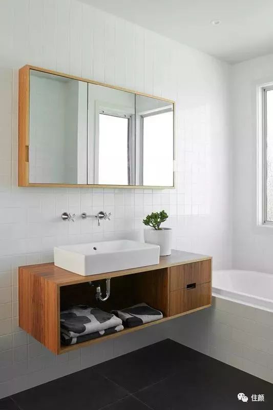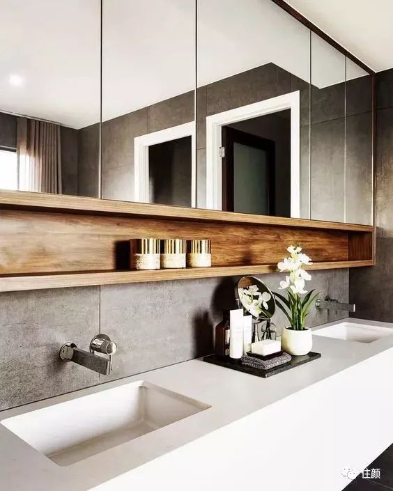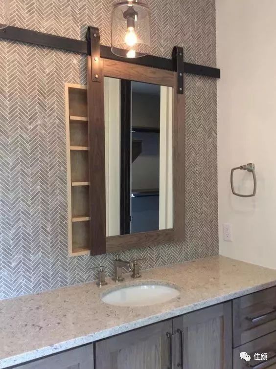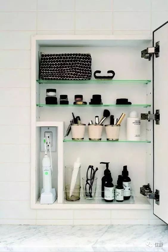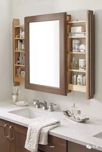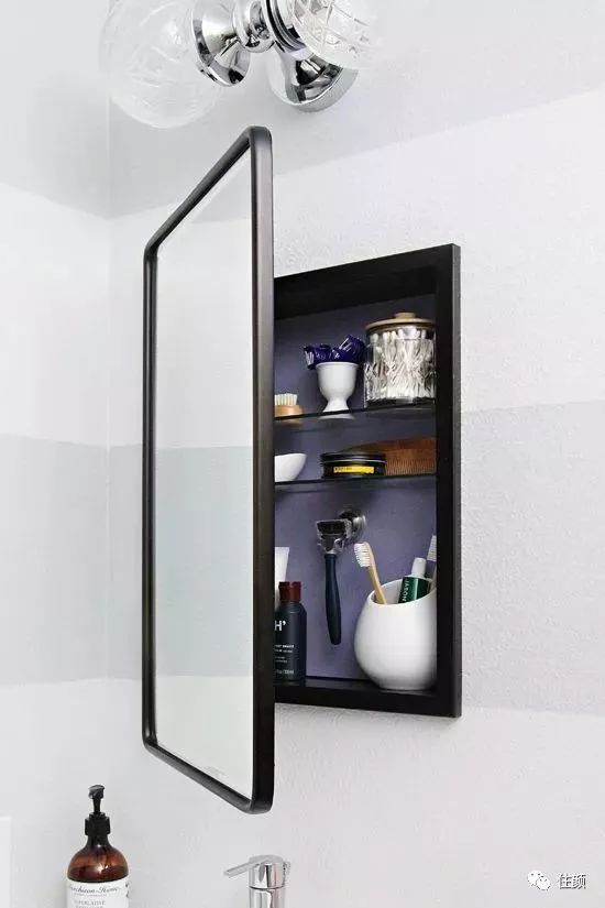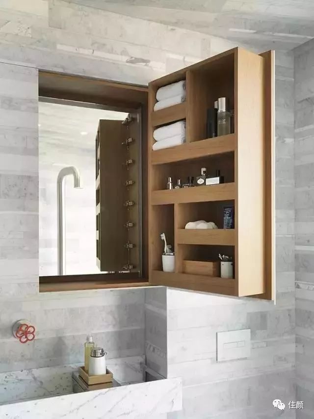 还有一种内嵌式镜柜,和浴室中的壁龛设计类似,可以在硬装期间就考虑把镜柜设计嵌入墙体,从外观上看,效果比较隐形。