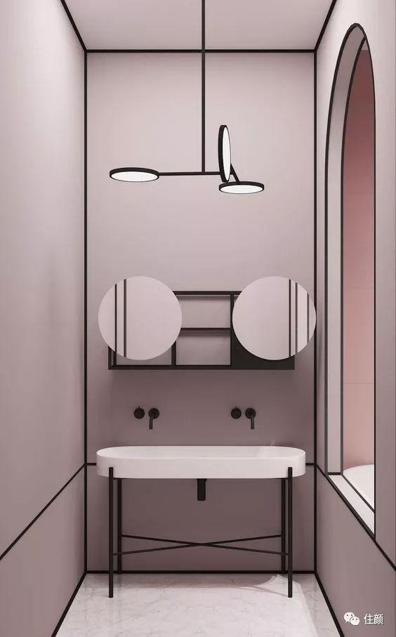 如果洗手台和座便器/浴缸在同一侧,也可把镜柜延伸到座便器/浴缸上方的空间,一是可以提供更多收纳,二是满墙的镜面能从视觉上扩大卫浴间的空间感。