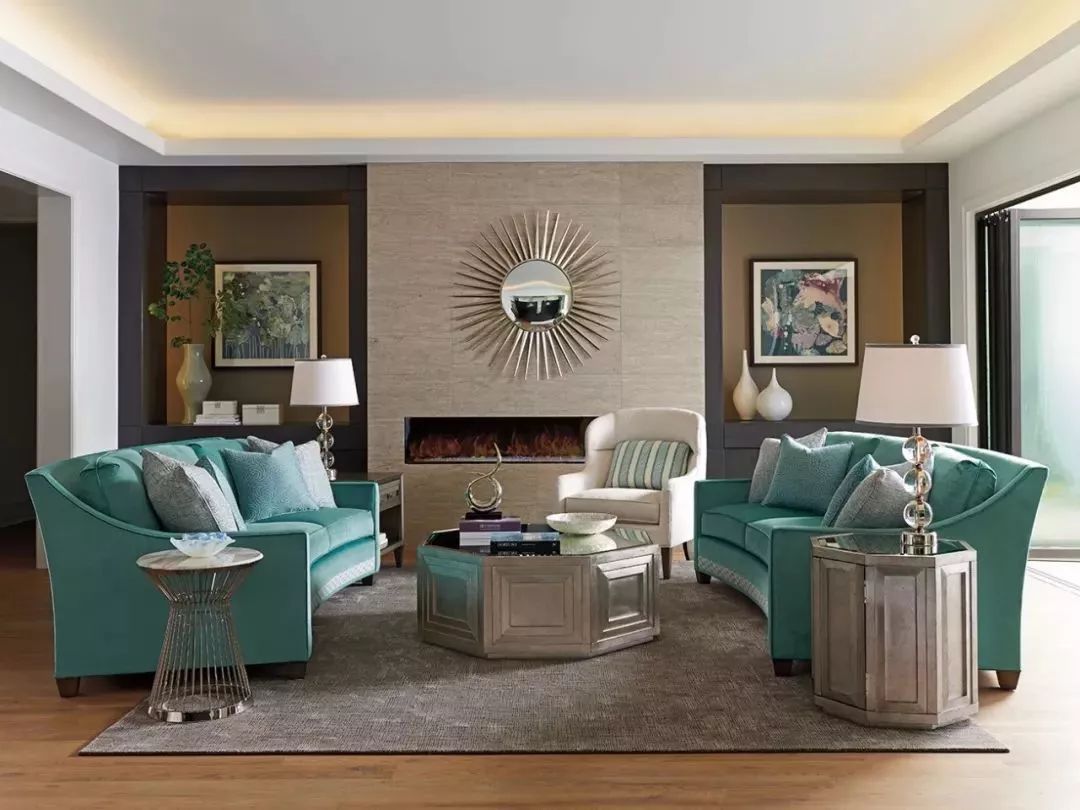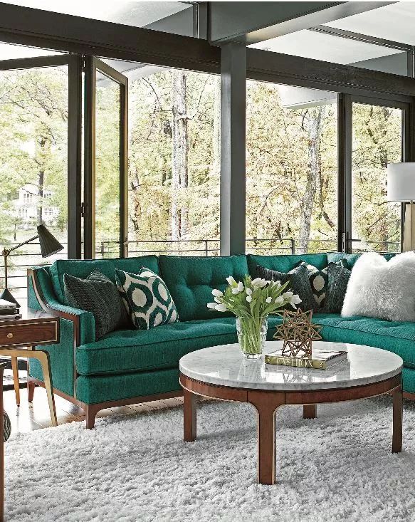 如果你比较纠结该用什么颜色,Valenza的三人Tiffany蓝沙发可以作为首选,纯色似淡实浓,给人的印象沉静睿智,可以效仿女主父母家用金属色茶边几来搭配。