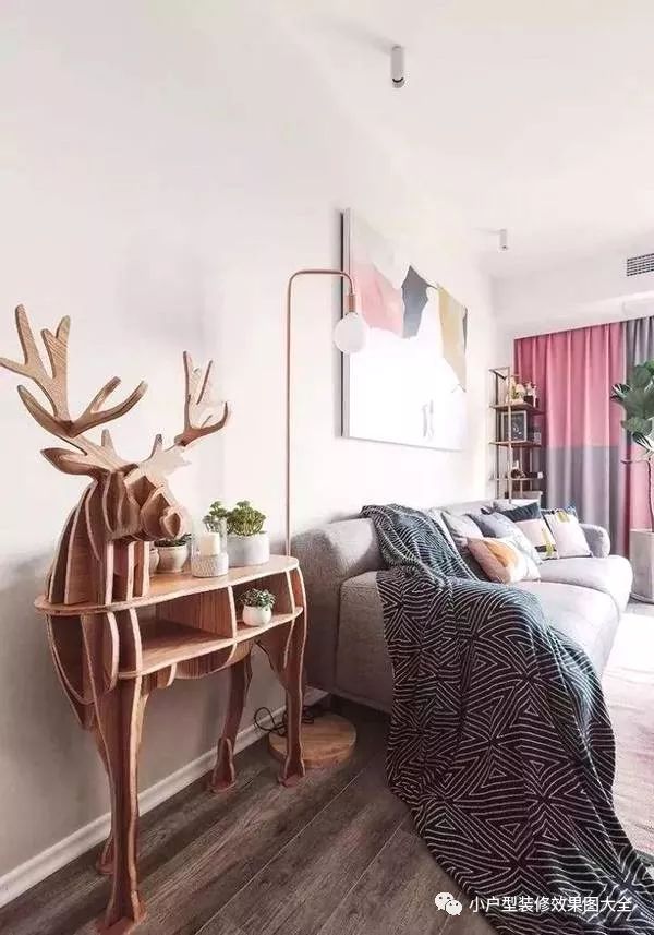 灰色的沙发搭配小型的茶几,最个性的就是沙发左边的麋鹿绿植展示架,二者的结合给整个空间一种生机的活力。