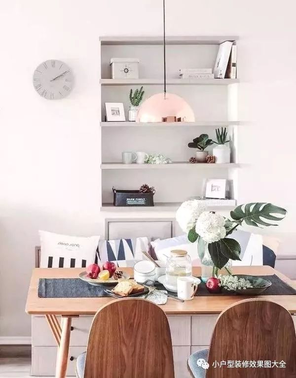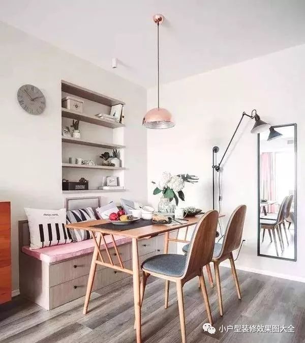 卡座样式的餐厅,卡座是定制的一个收纳柜,上边放置了一个粉色的长形坐垫,下方就是各种收纳抽屉,后边的背景墙上设计了一个壁龛,上边摆放些小物件。