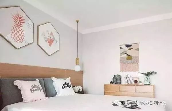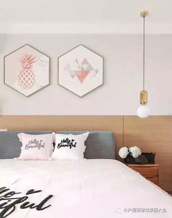 卧室透过金属质感的小吊灯,和温润的木作墙板,突显出樱花粉的女性色调。