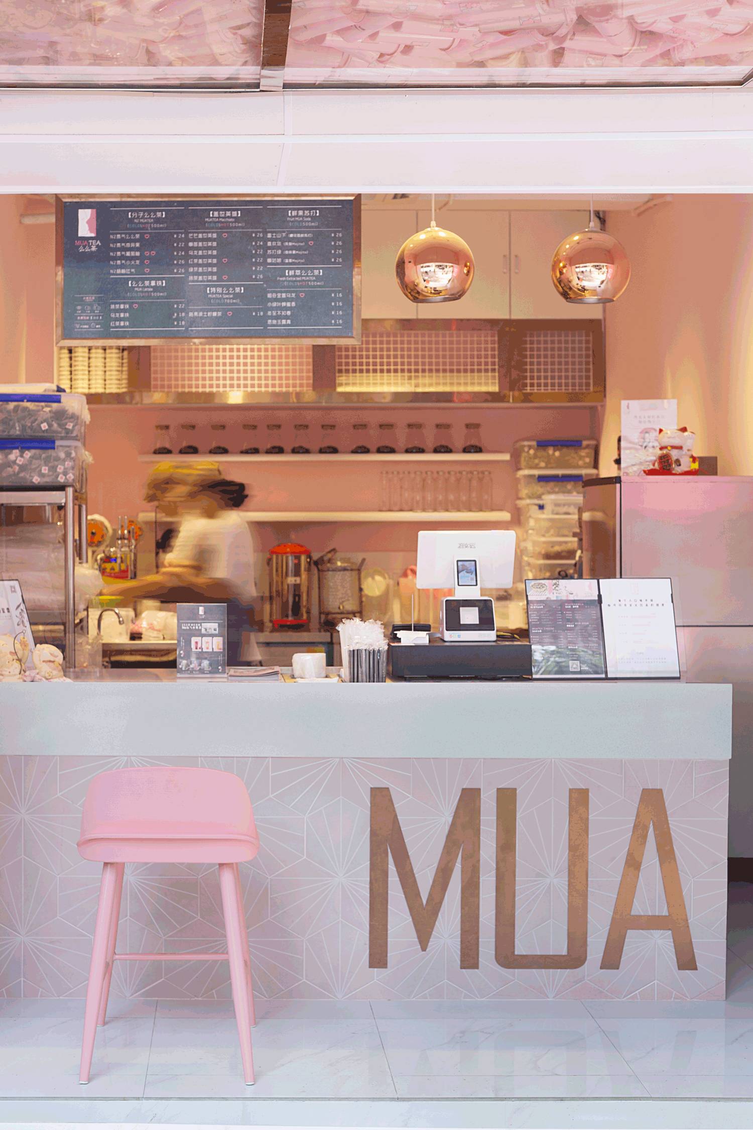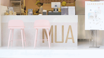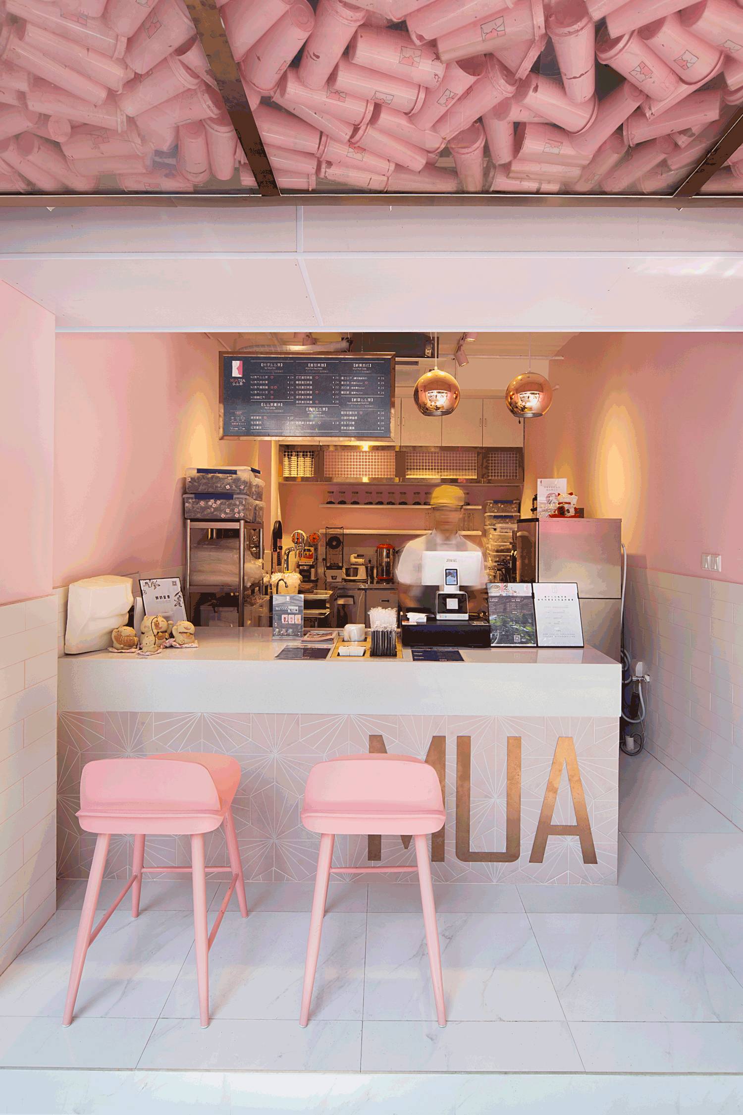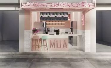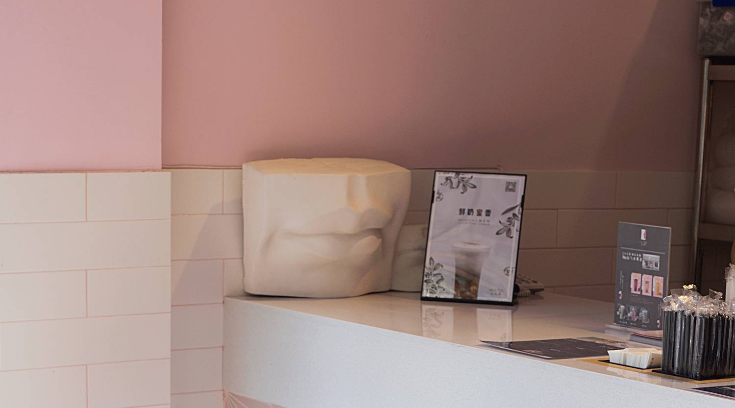 门头的设计尤其亮眼,透明的亚克力盒子,里面散落着粉色的饮料杯,远远看一眼就知道这是一家茶饮店,品牌辨识度非常高。墙面粉和白的分色设计,甜腻之中来了点清爽。