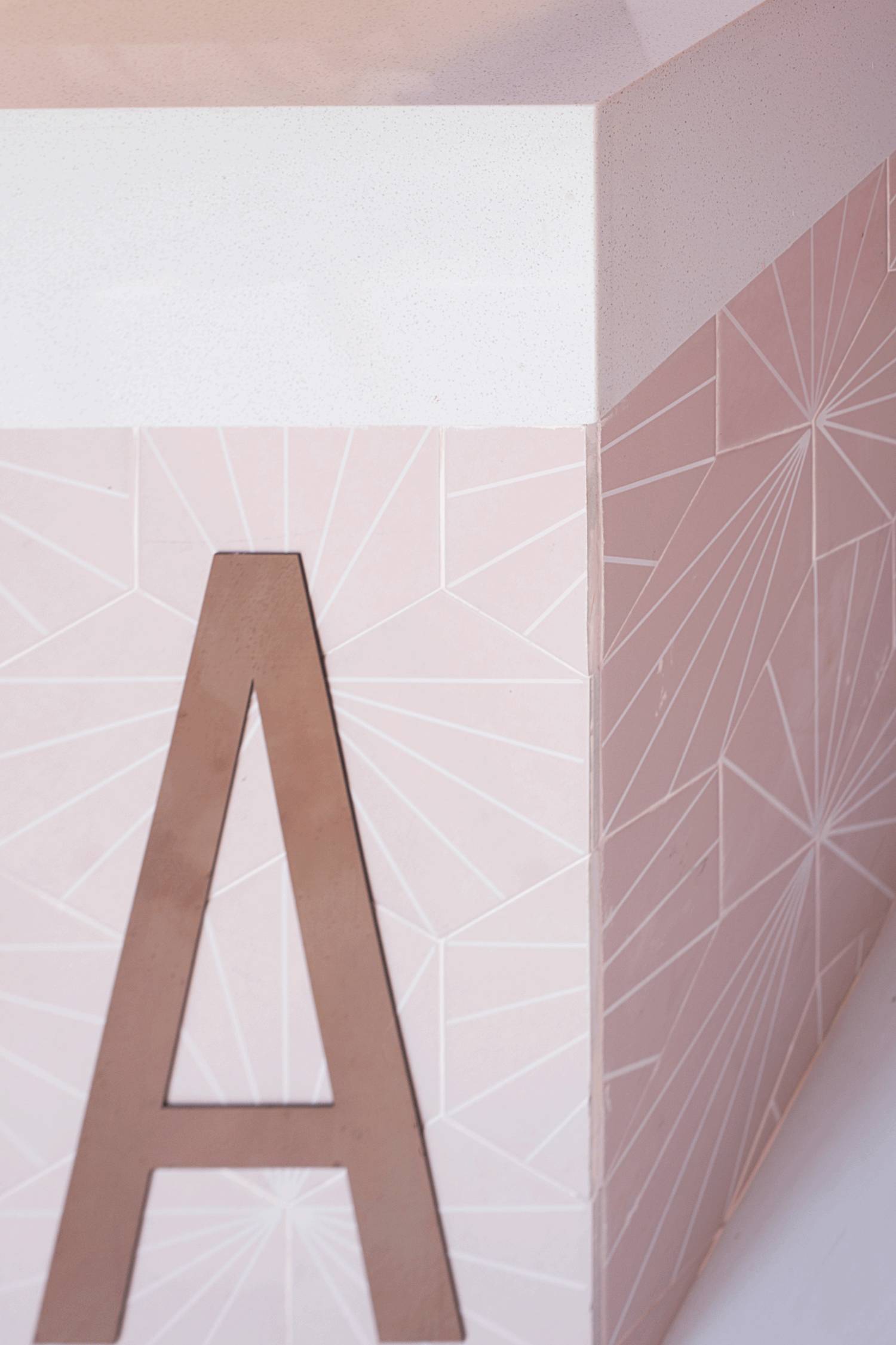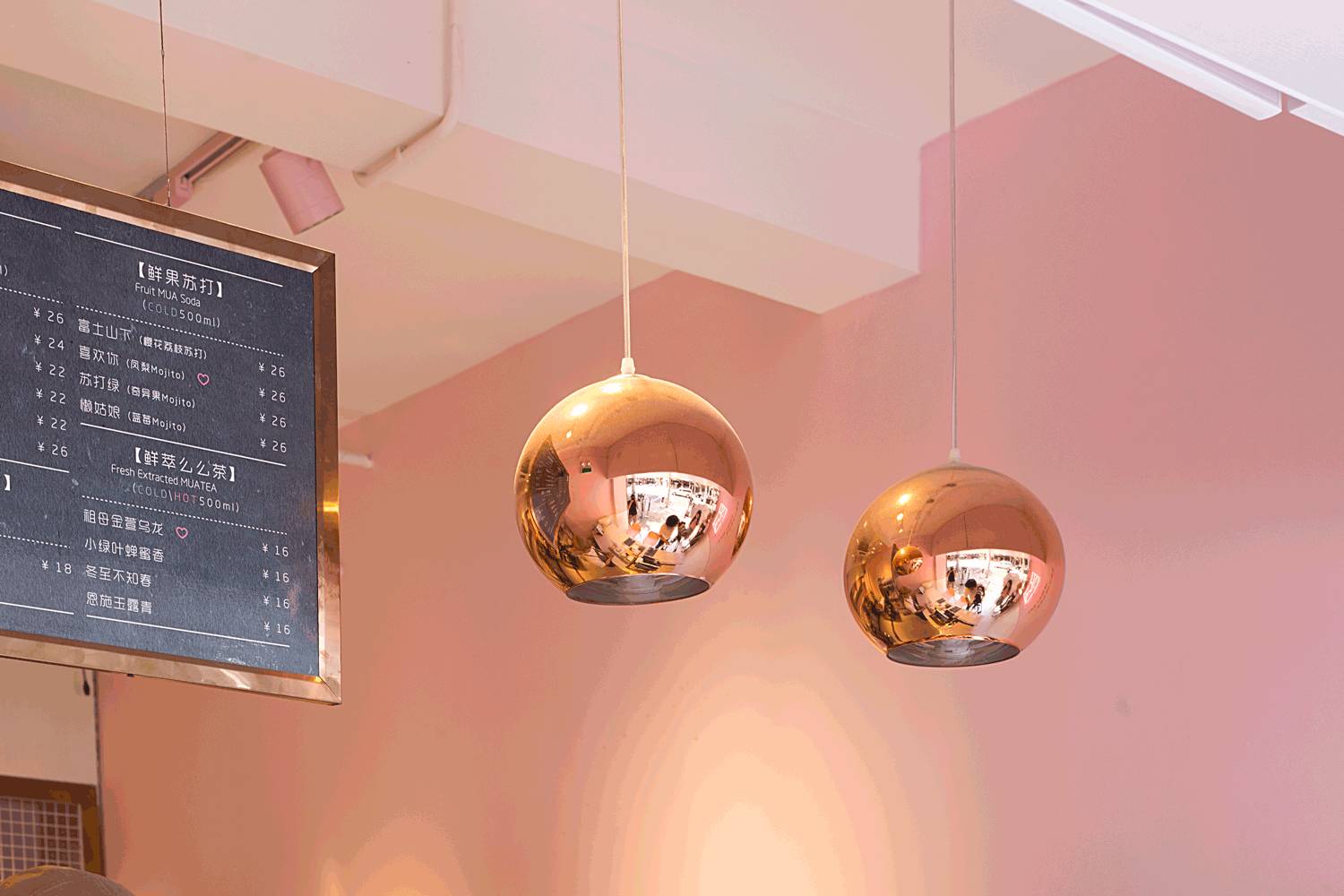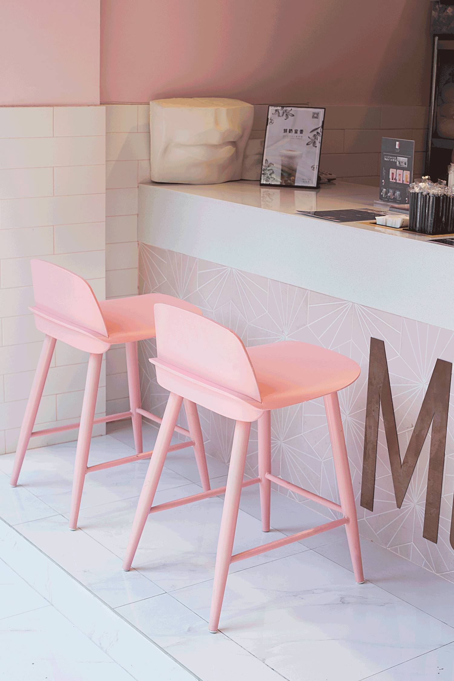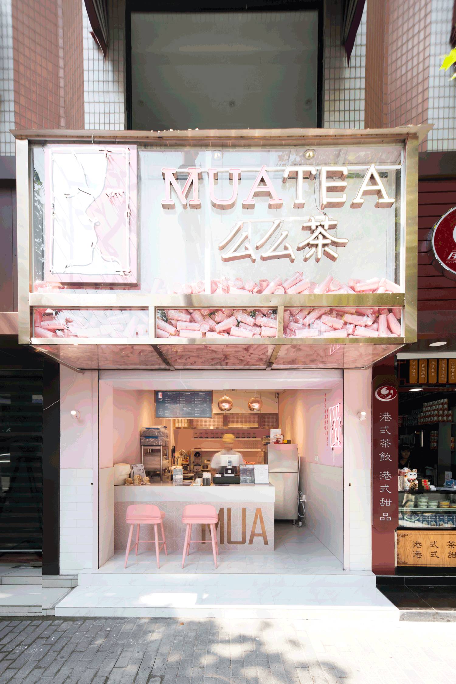 门头的设计尤其亮眼,透明的亚克力盒子,里面散落着粉色的饮料杯,远远看一眼就知道这是一家茶饮店,品牌辨识度非常高。墙面粉和白的分色设计,甜腻之中来了点清爽。