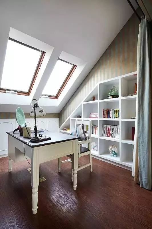 1 | 这是一间位于小阁楼的书房,斜顶的设计并没有难倒设计师,顺着倾斜的方向,一个小书柜便诞生了,以小换大,光线交给天窗,坐在桌前安安静静工作学习看书。
