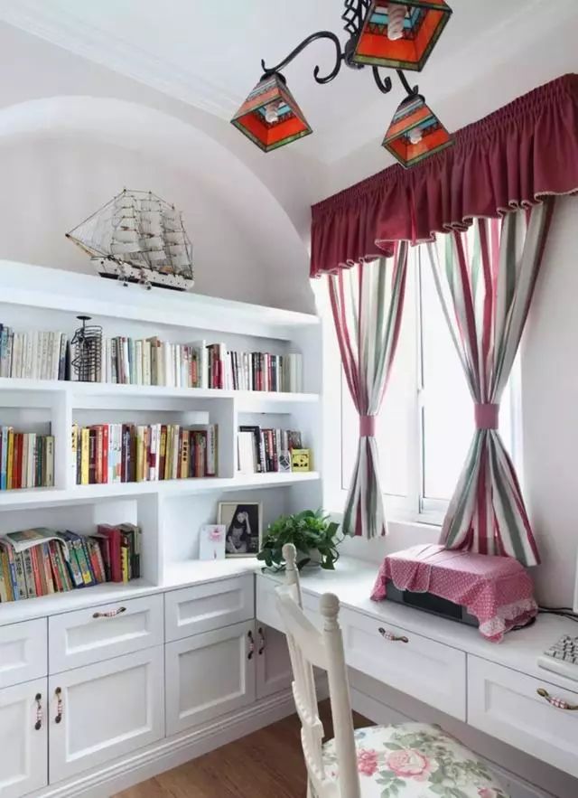 2 | 典型的靠窗书房设计,直角一面作书柜,一面作书桌。很清爽的设计,以白色为主色调,辅以糖果色的窗帘以及田园质感的坐垫,能让人静下心来来。