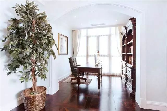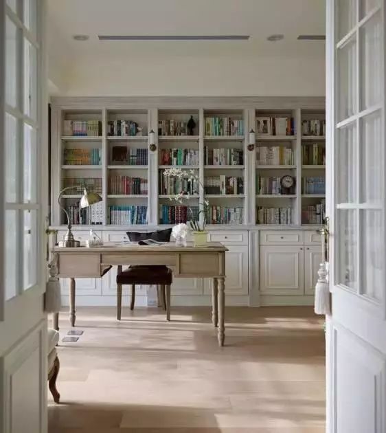 8 | 这套简欧书房,从象牙白色开始散发出它独特的气质。书房空间够大,打造靠墙书柜+落地窗就不会错了。