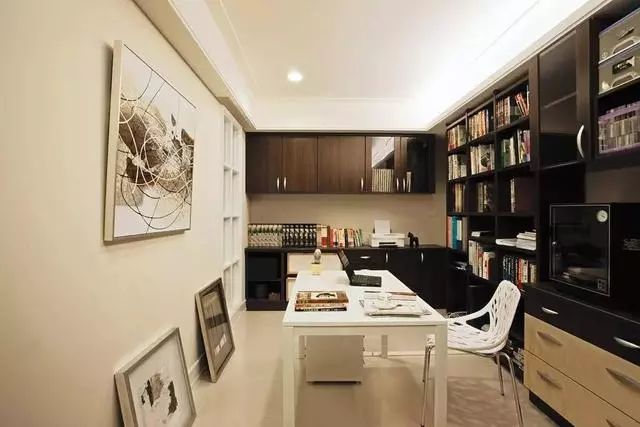 4 | 有序与无序的成功结合,让这款书房在沉稳当中带了点灵动。沉稳来自于整齐摆放的书籍,灵动从随性放置的装饰画身上溢出。