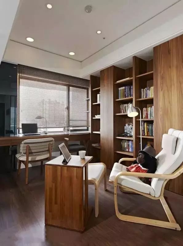 7 | 这个书房不仅有靠窗的传统长书桌设计,它还设计了一个悠闲摇篮椅的位置,再搭配一个放脚的小桌子,跟设计巧妙的小木桌刚好契合,看剧啥的不能更舒服了。