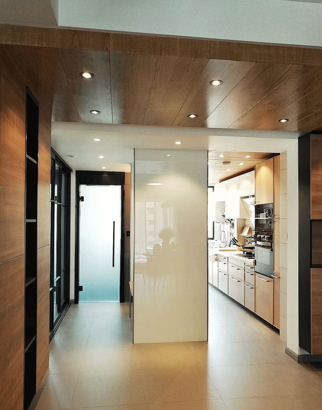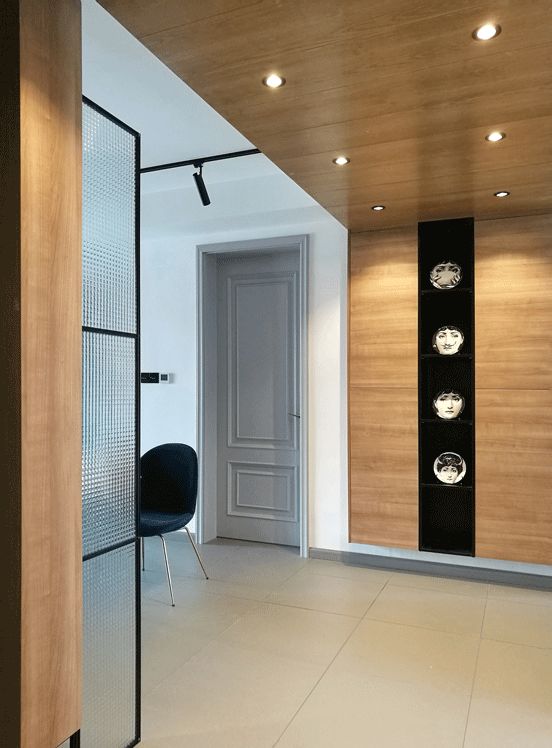 用专门定制了木质柜子和顶面来强化玄关区域,后来又加了玻璃隔断。