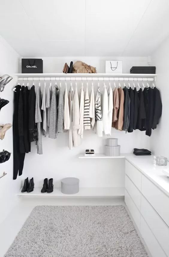 挂衣的标准可以按长短、类别、色系,也可以几种标准综合起来。建议按先按长短分类,这样短款衣服下面剩下的空间还可以利用起来,放一些收纳的抽屉或者框子,放个行李箱也不是不可以~