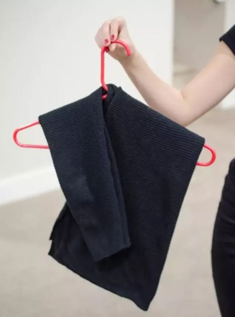 毛衣类的其实不适合挂着,会容易变形,可以用这种方法挂起来,也可以叠起来收纳。