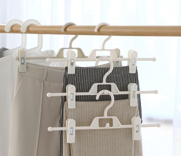 比较短的衣服也可以用衣架挂好,再叠挂起来。这种可以层叠的衣架就很好用,一个衣架的垂直空间可以挂好几件衣服。