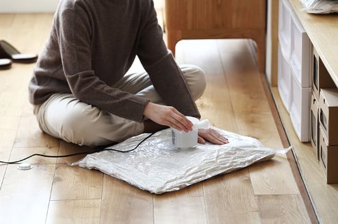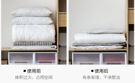 那些体积庞大的羽绒服和棉袄,如果收纳空间不够,就可以用抽真空机抽一下,可以大大减少占用面积,而且也有一定的防潮防霉的功效。