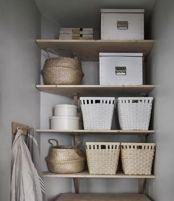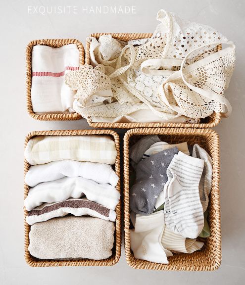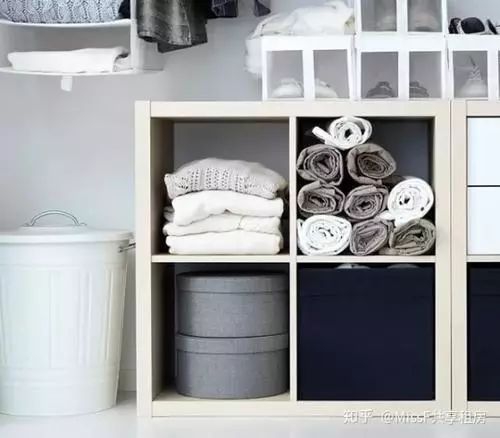 或者你会说我衣柜里没抽屉那咋办呢?可以改造啊!加个尺寸合适的收纳筐,拖出来不就是个抽屉了么。这样整个格子里的东西一目了然,用起来多方便。
