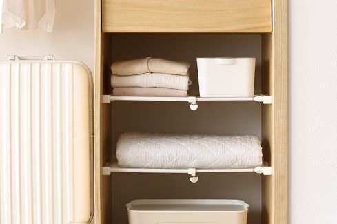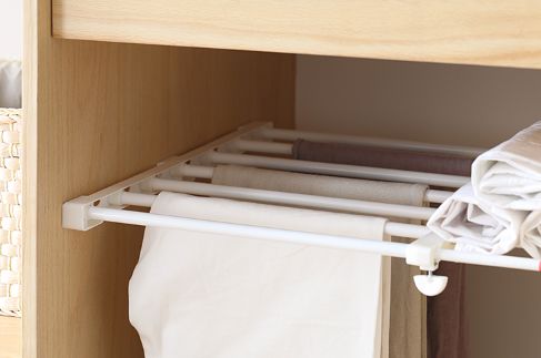 所以怎么解决呢?有一种分隔架,可以把一个比较高的格子分成几层。这样分开来摆,就不会拿一件衣服动了整个格子的衣服。