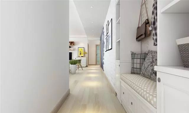 这里是入户门的地方,玄关鞋柜布置的很贴心,可以坐下来换鞋子,很方便。地面上采用浅色木地板装饰,更有清新韵味。