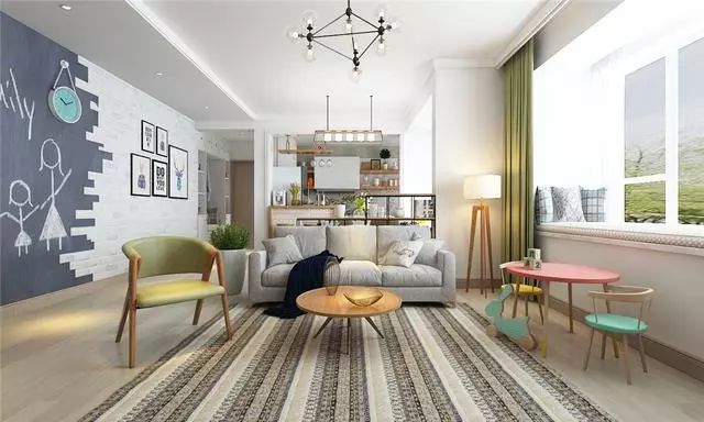 在色调的布置上,房间整体也显得很舒适温馨,浅色地板,灰色沙发,绿色座椅,阳台上还有粉色小桌,看起来格外漂亮。