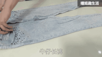 先把裤子卷起来,参考打底裤的叠法
