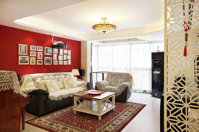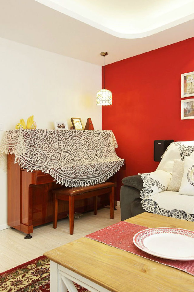 钢琴上披着米色勾花布,静静靠在红墙上,文艺加乡村风,若是弹奏一曲《风之甬道》,这田园式就活了。