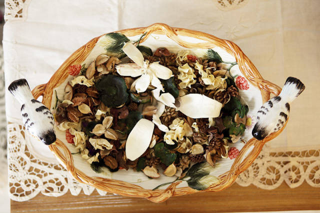 小鸟花盘,放这些干花,一是使房间充满田园花香,二是田园摆设的小物件,增加田园意境。