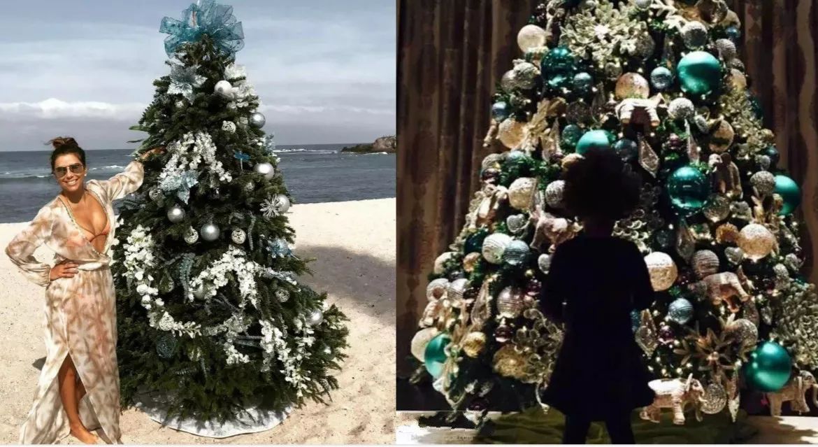 左边大S家的圣诞树也用了宝蓝色,但是颜色用太多了,看着有点油腻。右边李玟家的宝蓝配金色,大气多了。