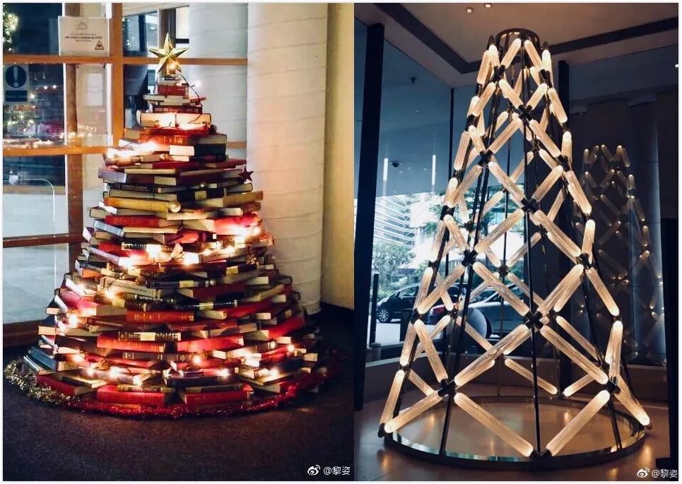 圣诞树也不是一定要用树的,黎姿在微博晒图,用书和灯管一样可以。
