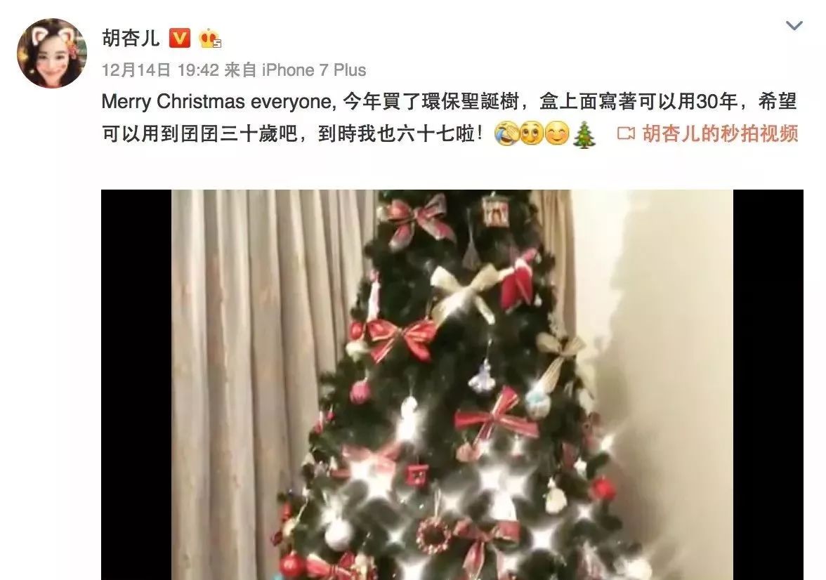 或者像胡杏儿一样,买一棵能用很久的环保圣诞树,让它陪着孩子成长。