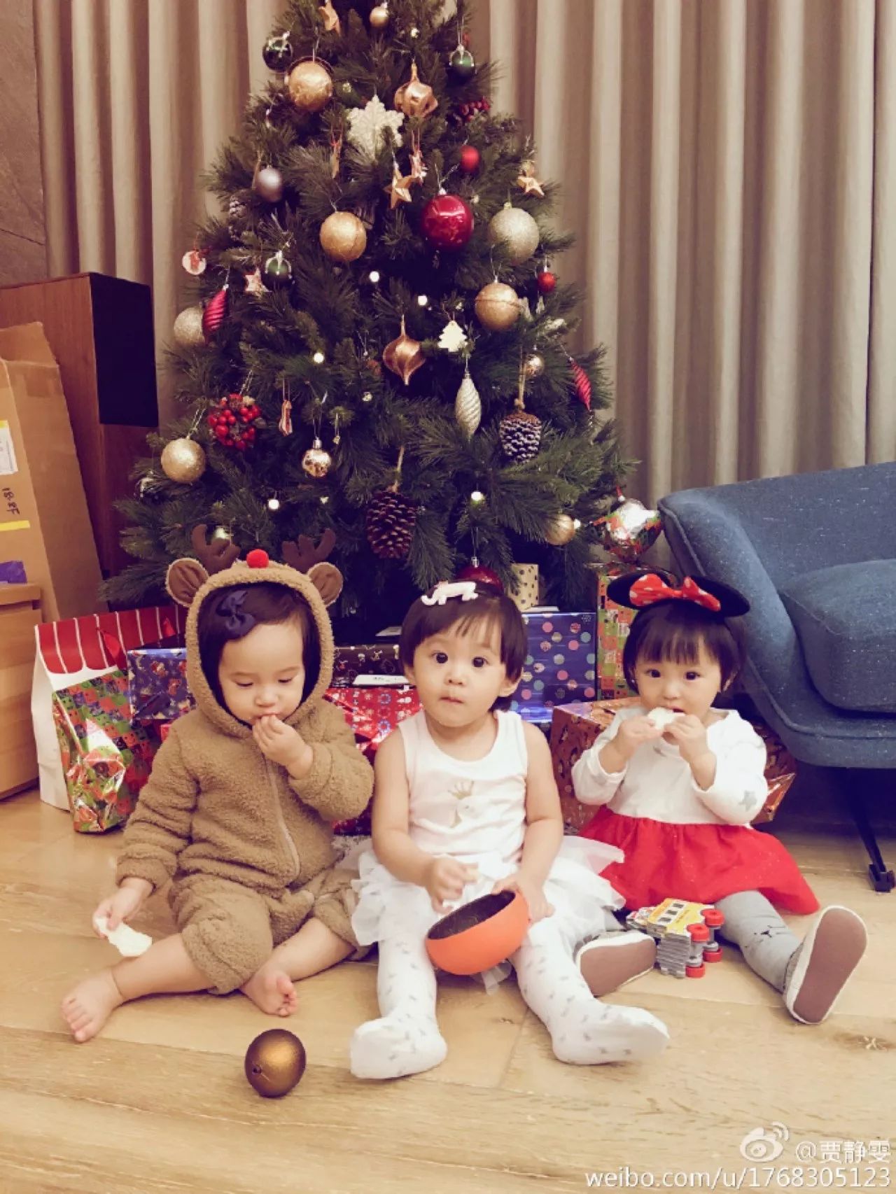 贾静雯家的三个宝贝排排坐,特别有爱。