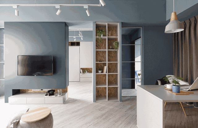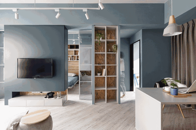 灰色的小型布艺沙发,后边的沙发背景墙采用了撞色的设计,更显空间的立体感。电视背景墙是一个很新奇的设计,深蓝色的盒子形状的背景墙,下方的壁龛正好用来整理各种搭配电视的小家电。