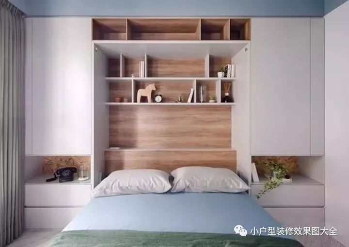 床头的对称设计,上方的原木材质展示架,也是很棒的收纳设计。